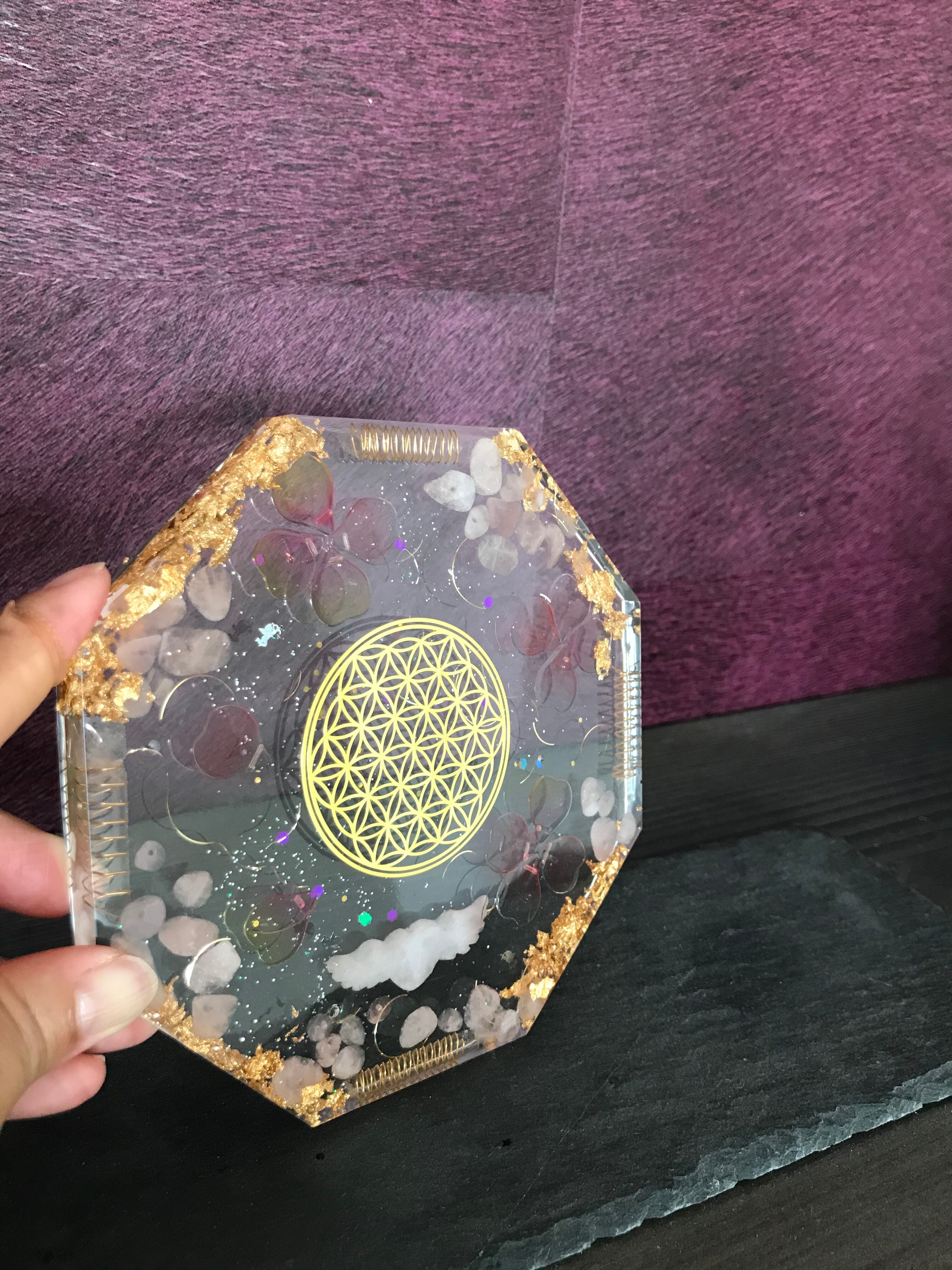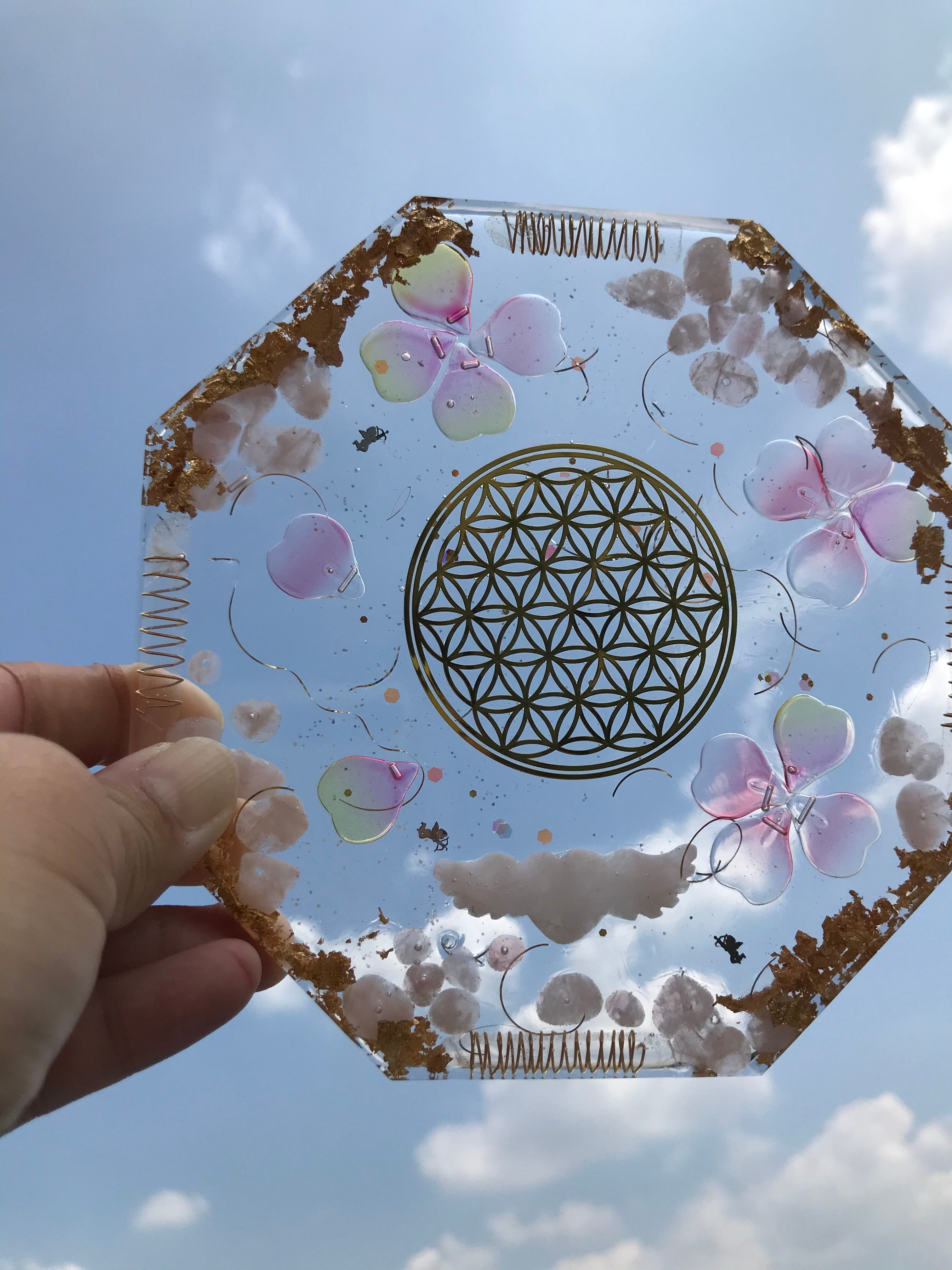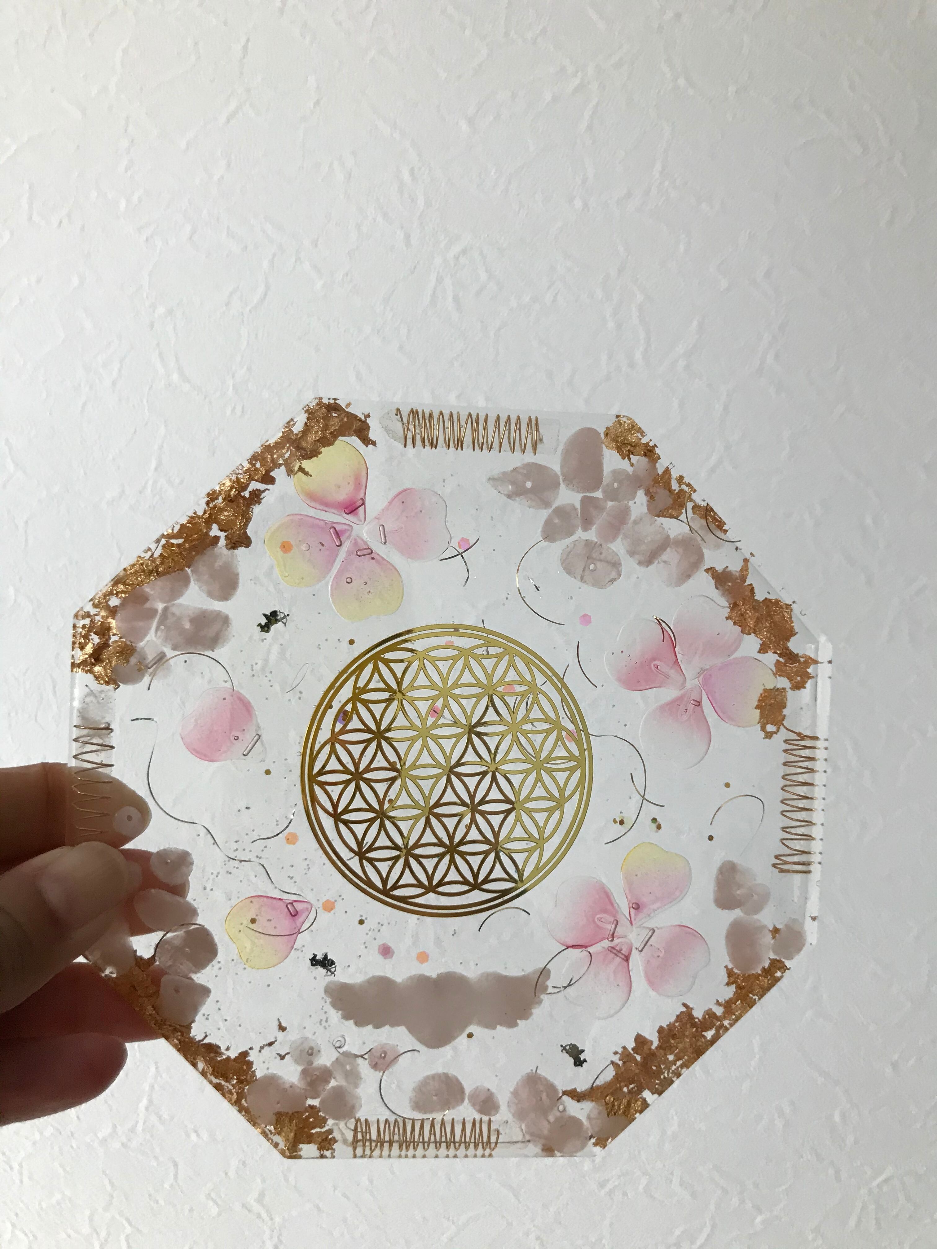 八角形の形のオルゴナイト。大きめのフラワーオブライフによって愛につつまれ、更に女性性を最大限に引き出すローズクオーツを入れました。