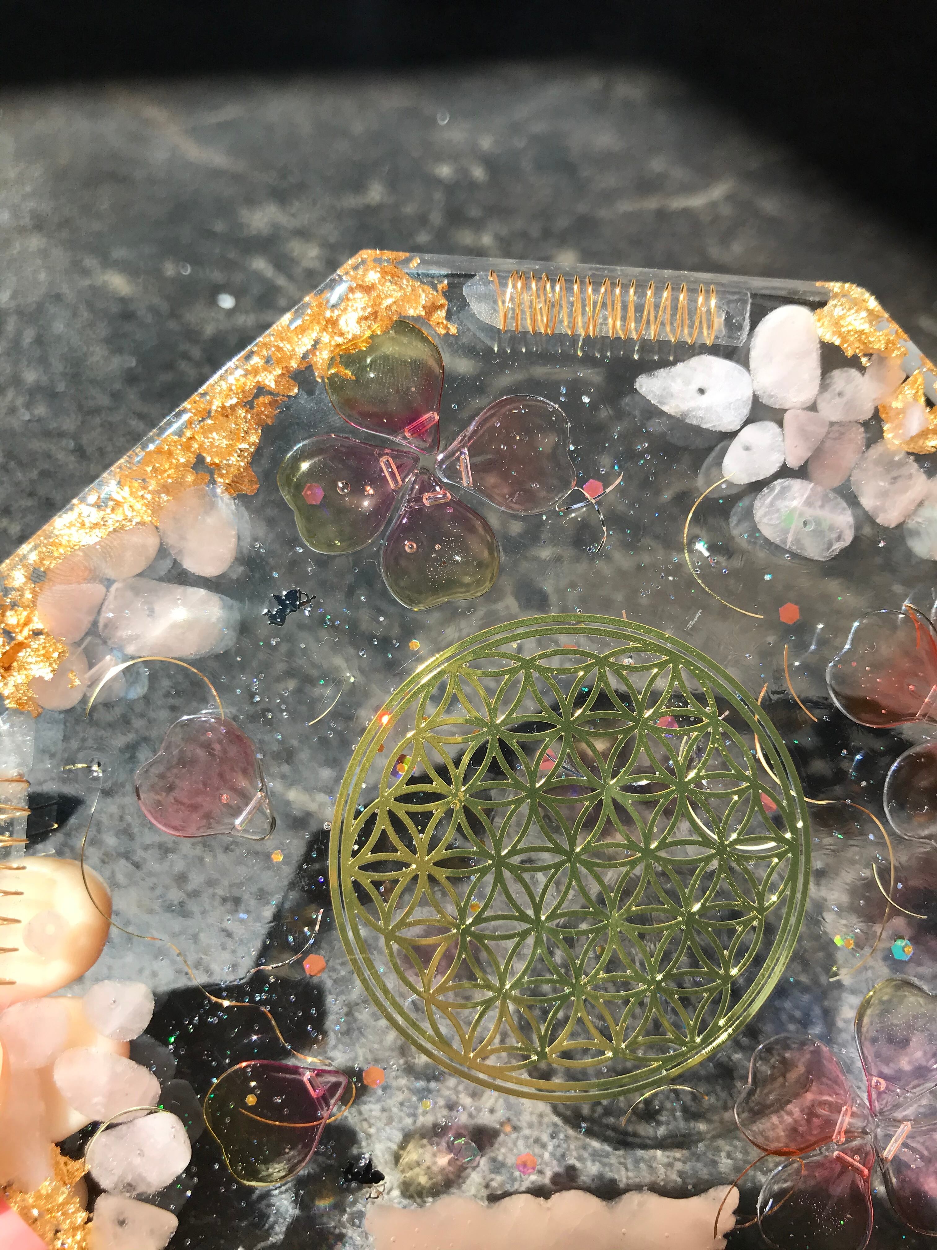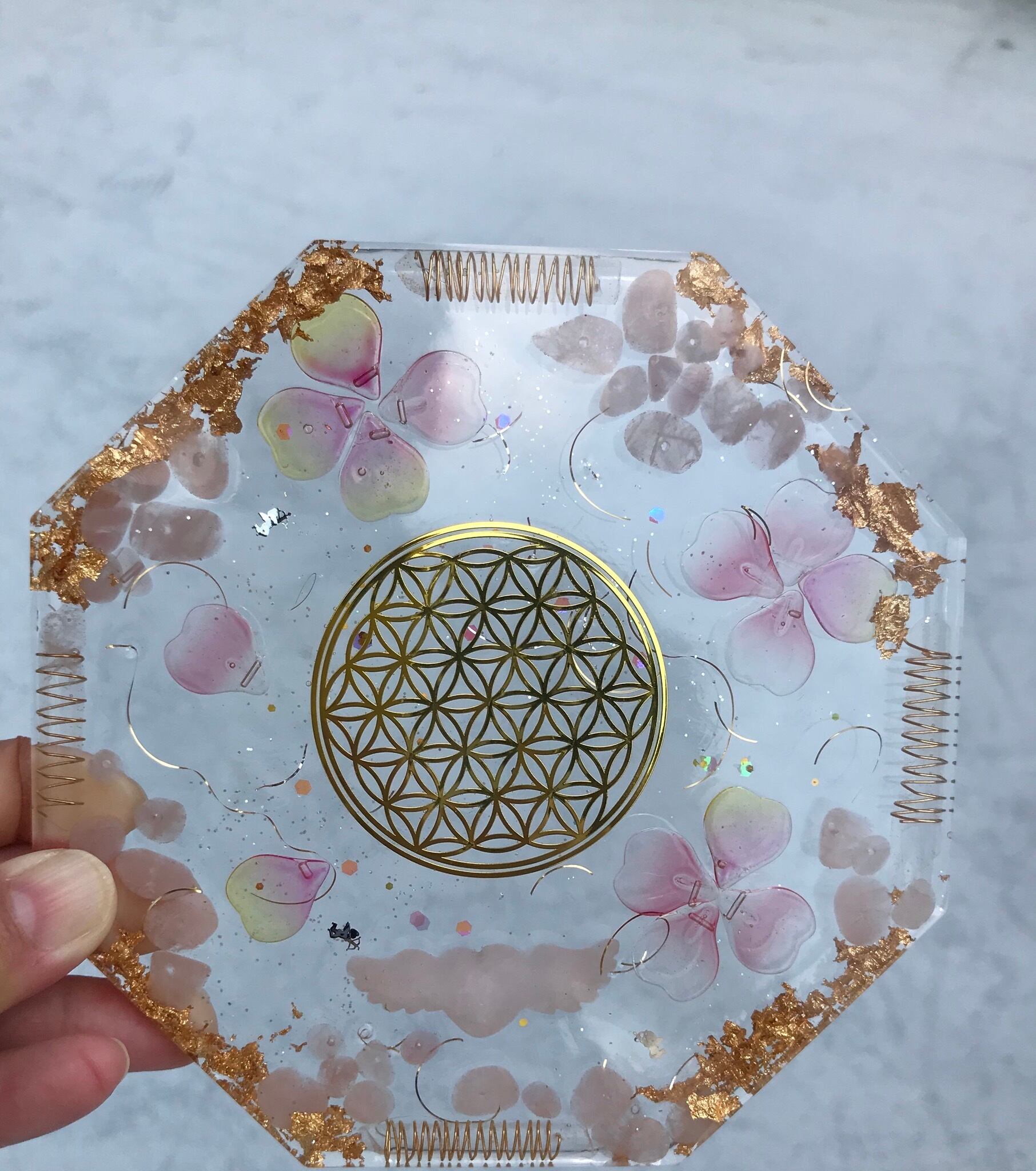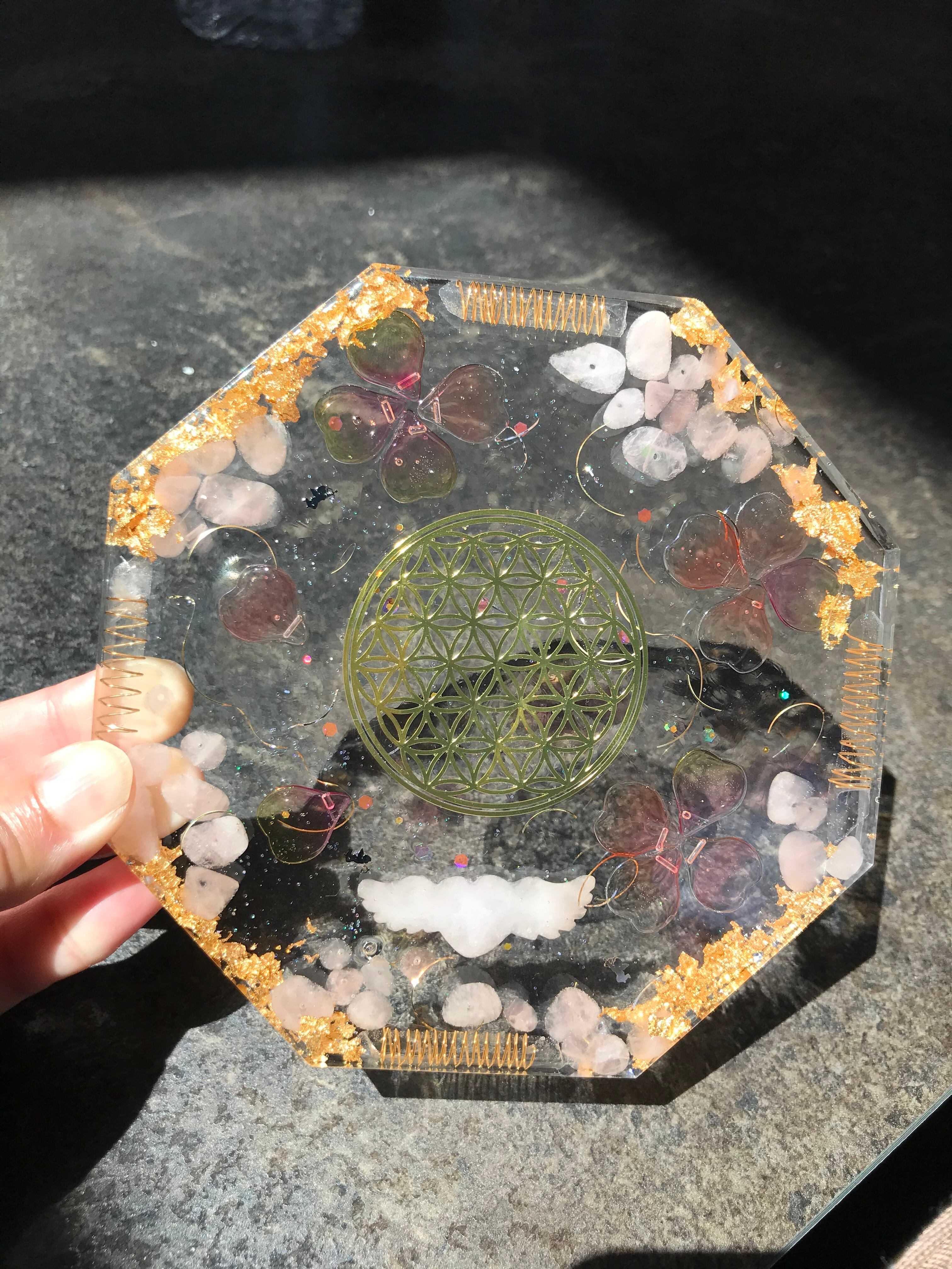 八角形の形のオルゴナイト。大きめのフラワーオブライフによって愛につつまれ、更に女性性を最大限に引き出すローズクオーツを入れました。