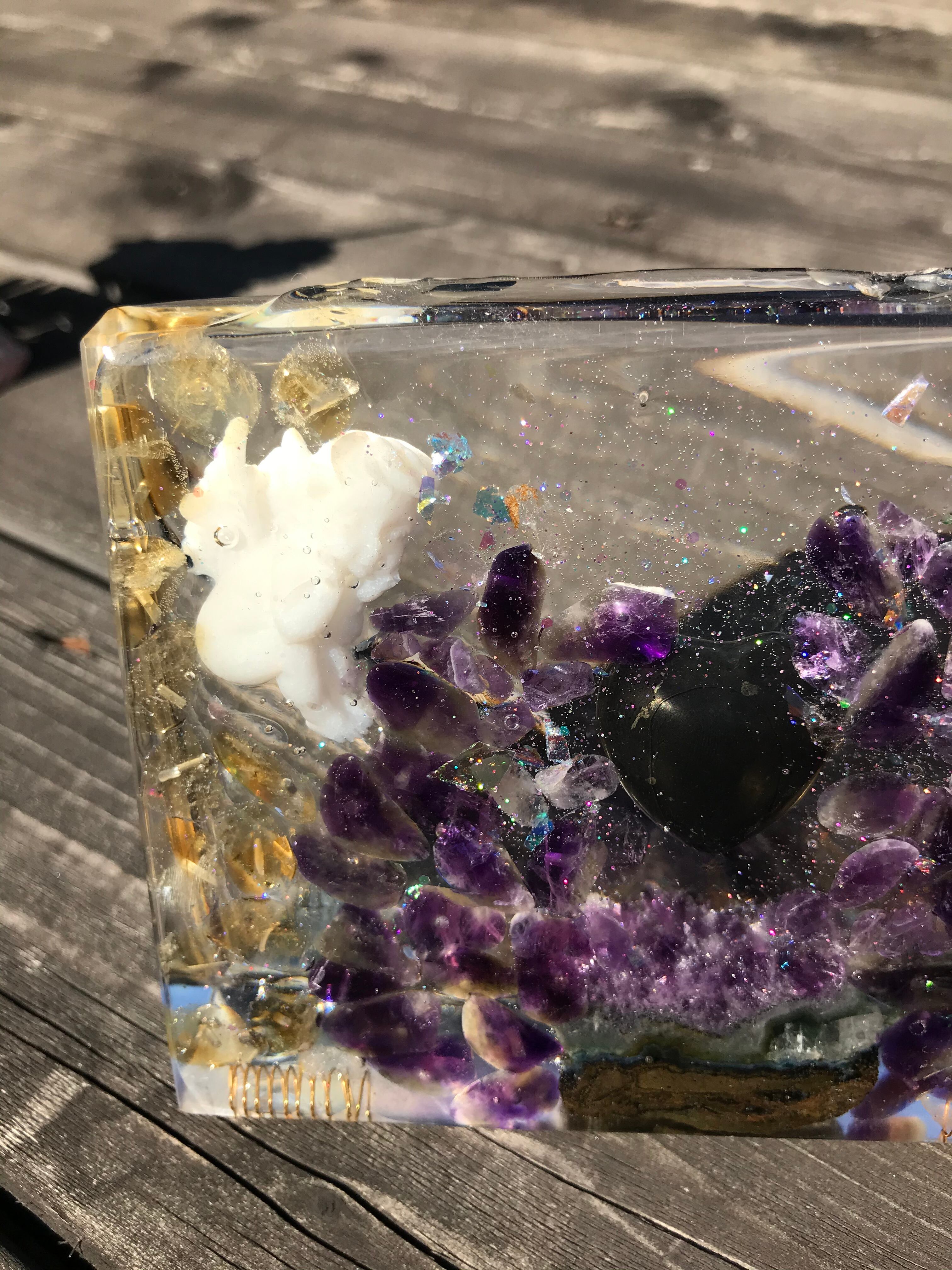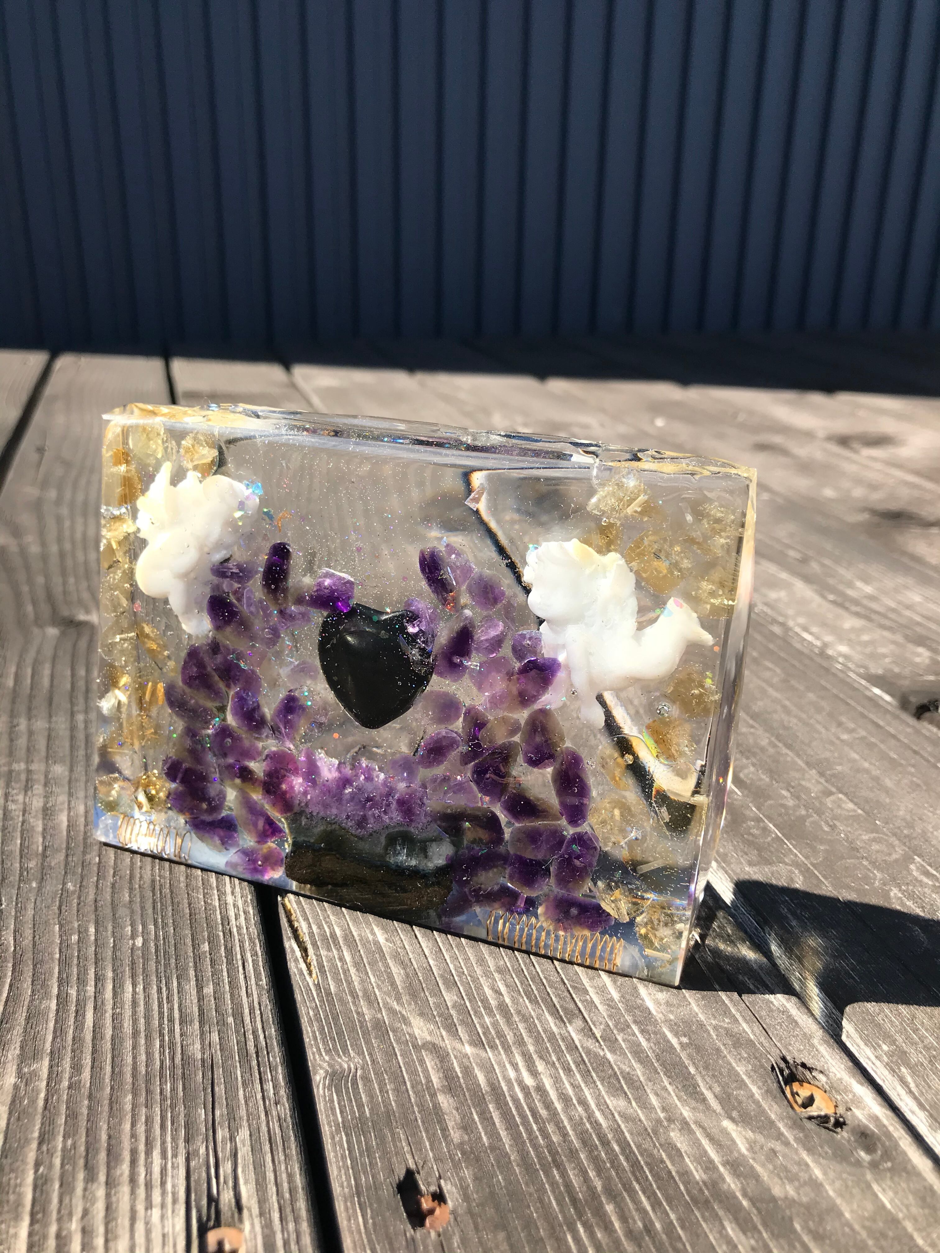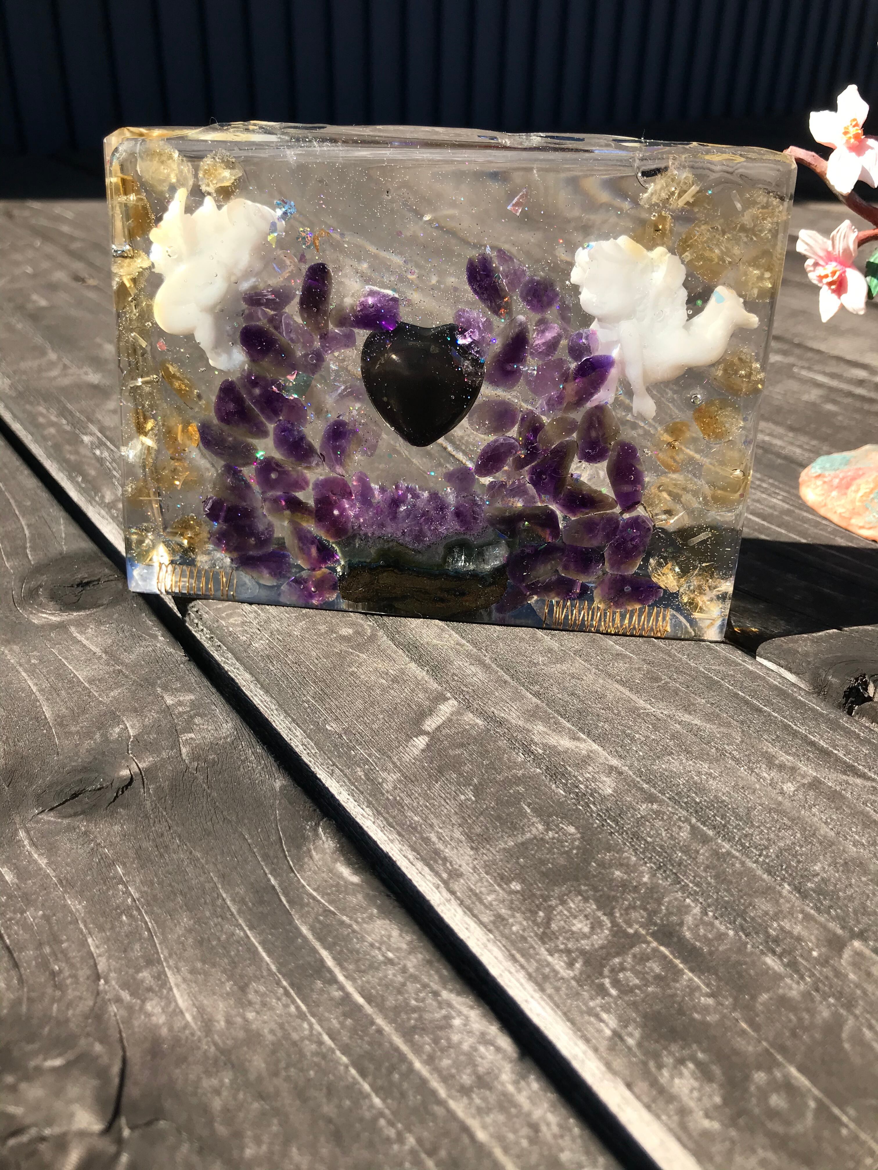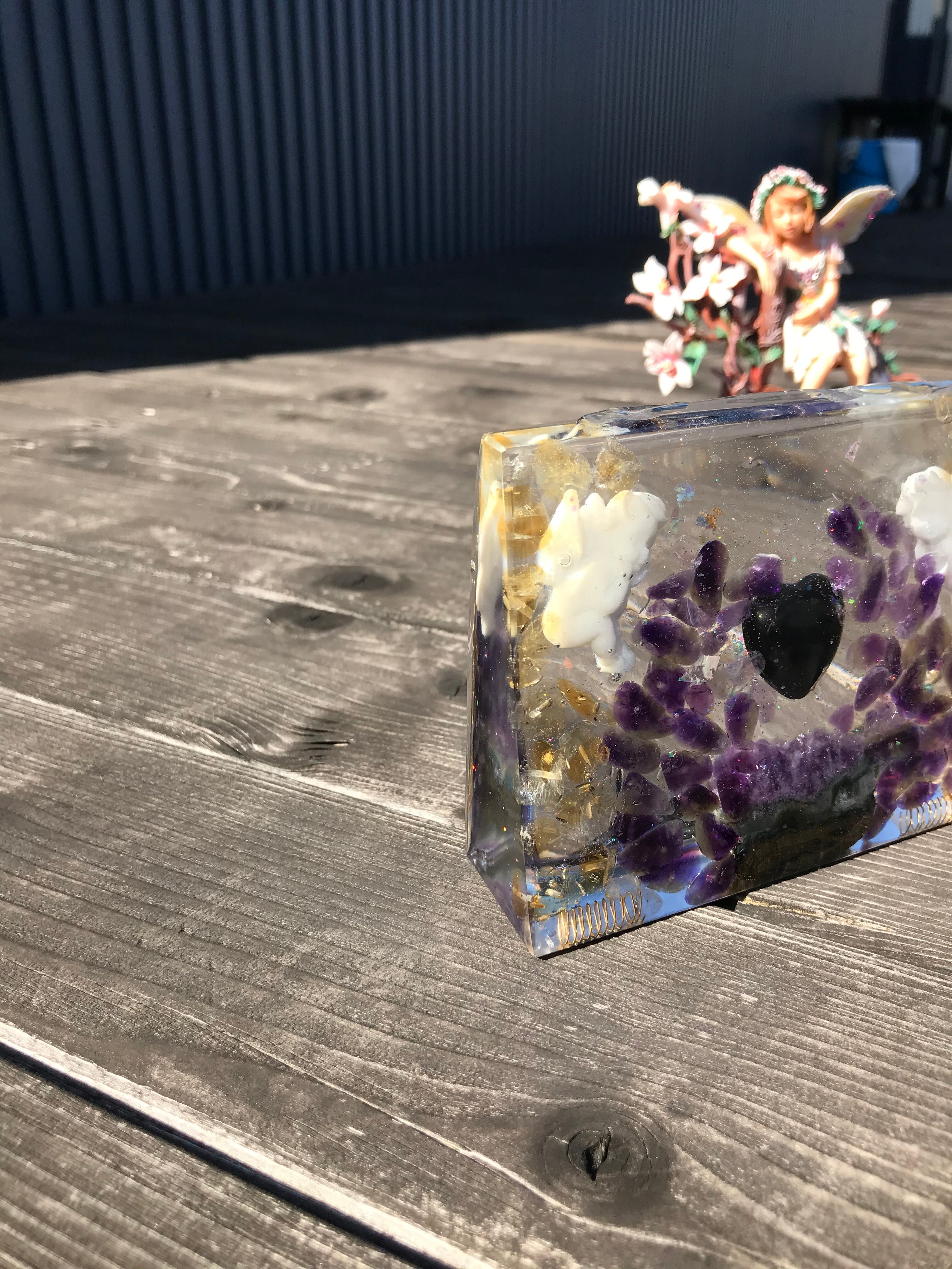 オルゴナイトは、金属や水晶などの鉱物(無機物)樹脂(有機物)で固めたもので、自然界に存在するネガティブなエネルギー(電磁波・放射線・想念など)を吸収し、ポジティブなオルゴン・エネルギーを発生する装置と言われています