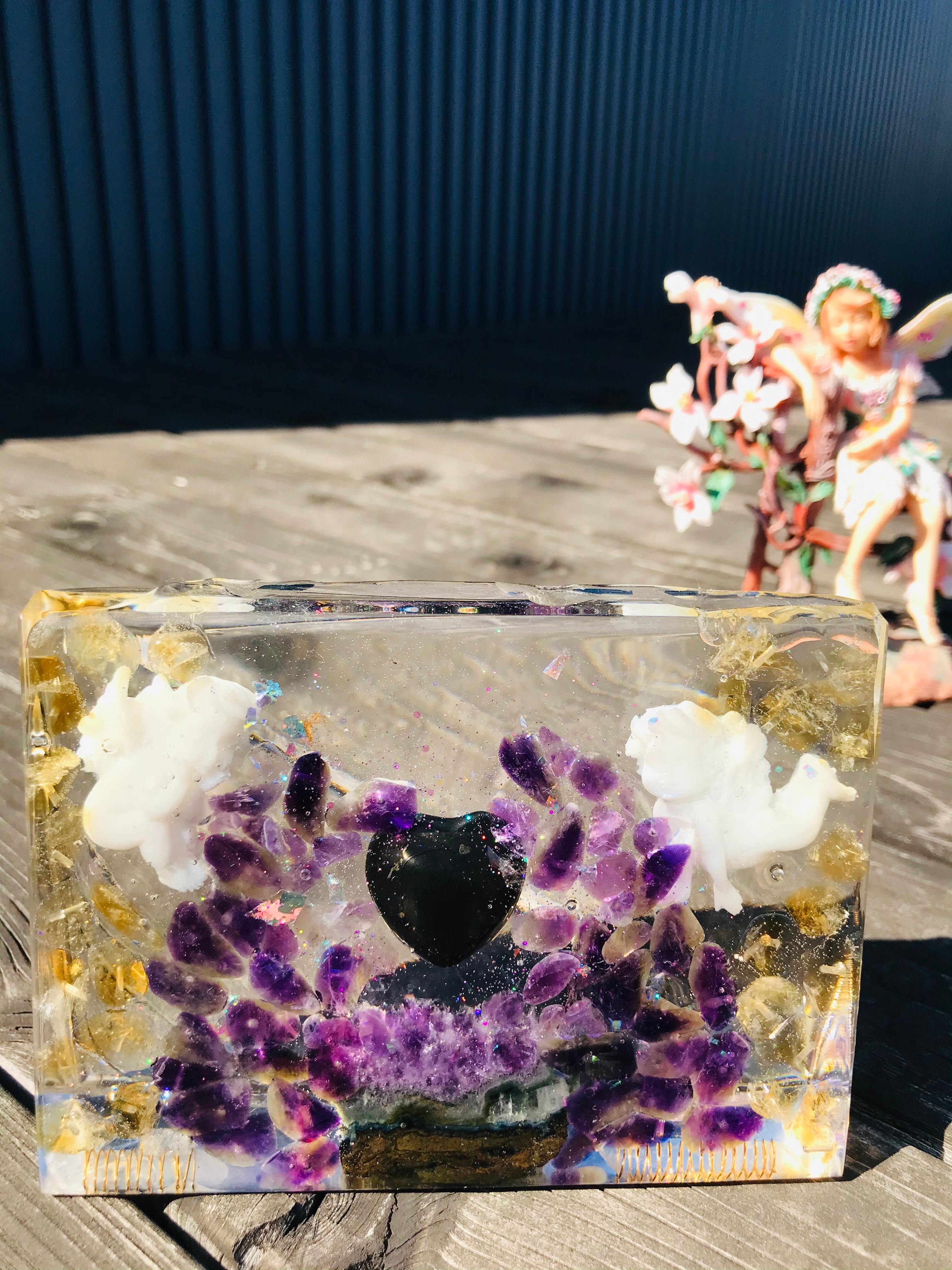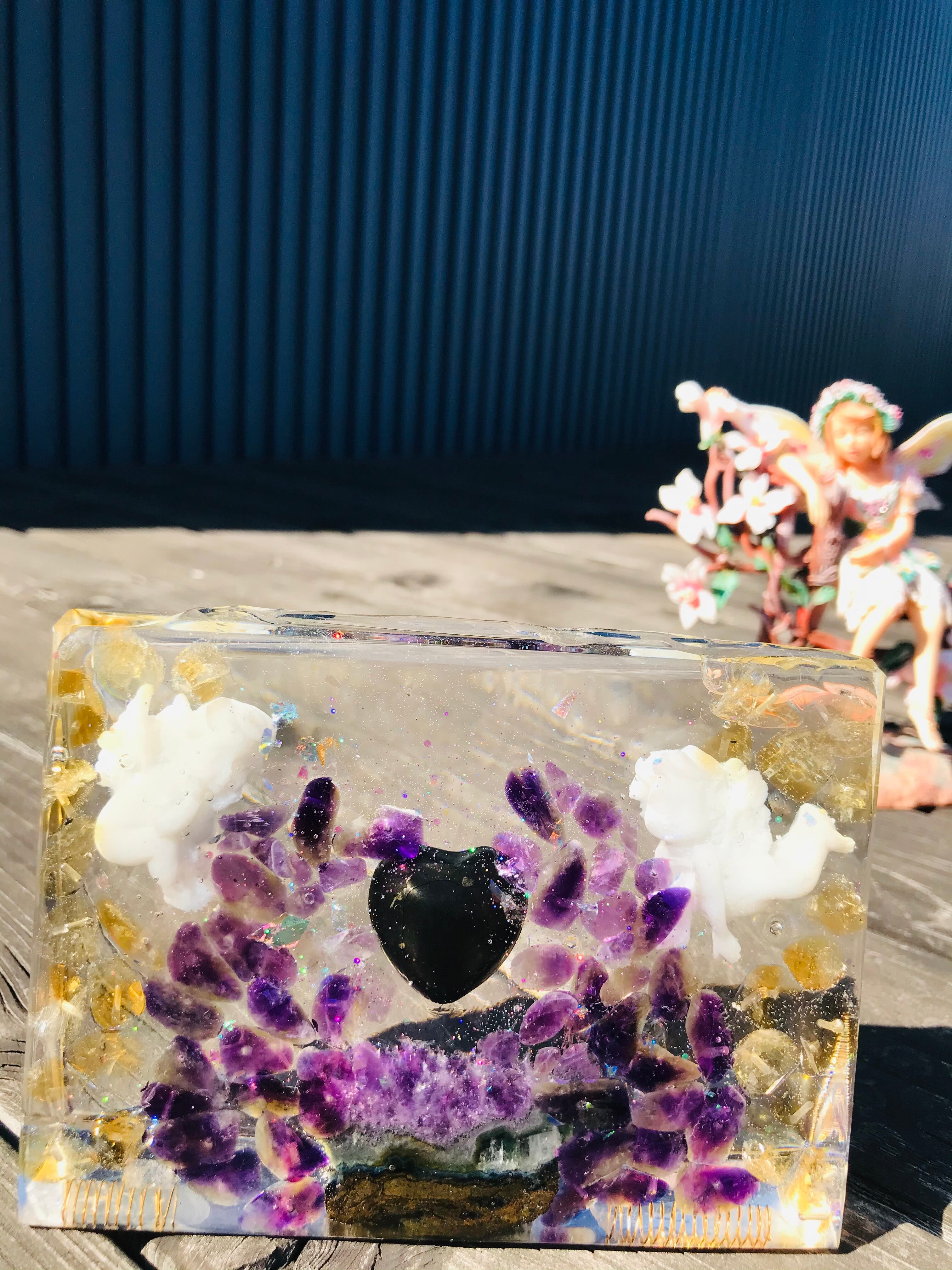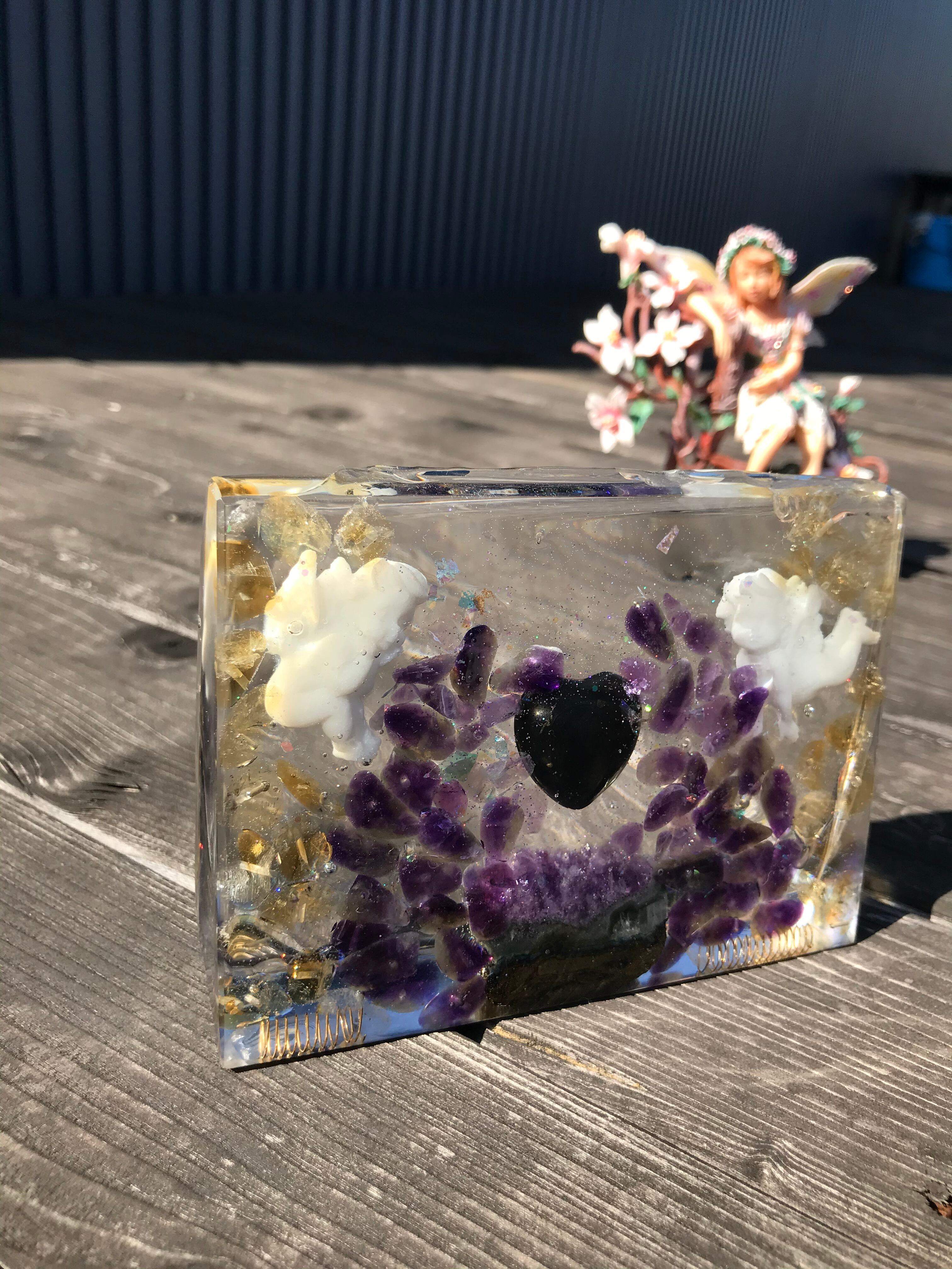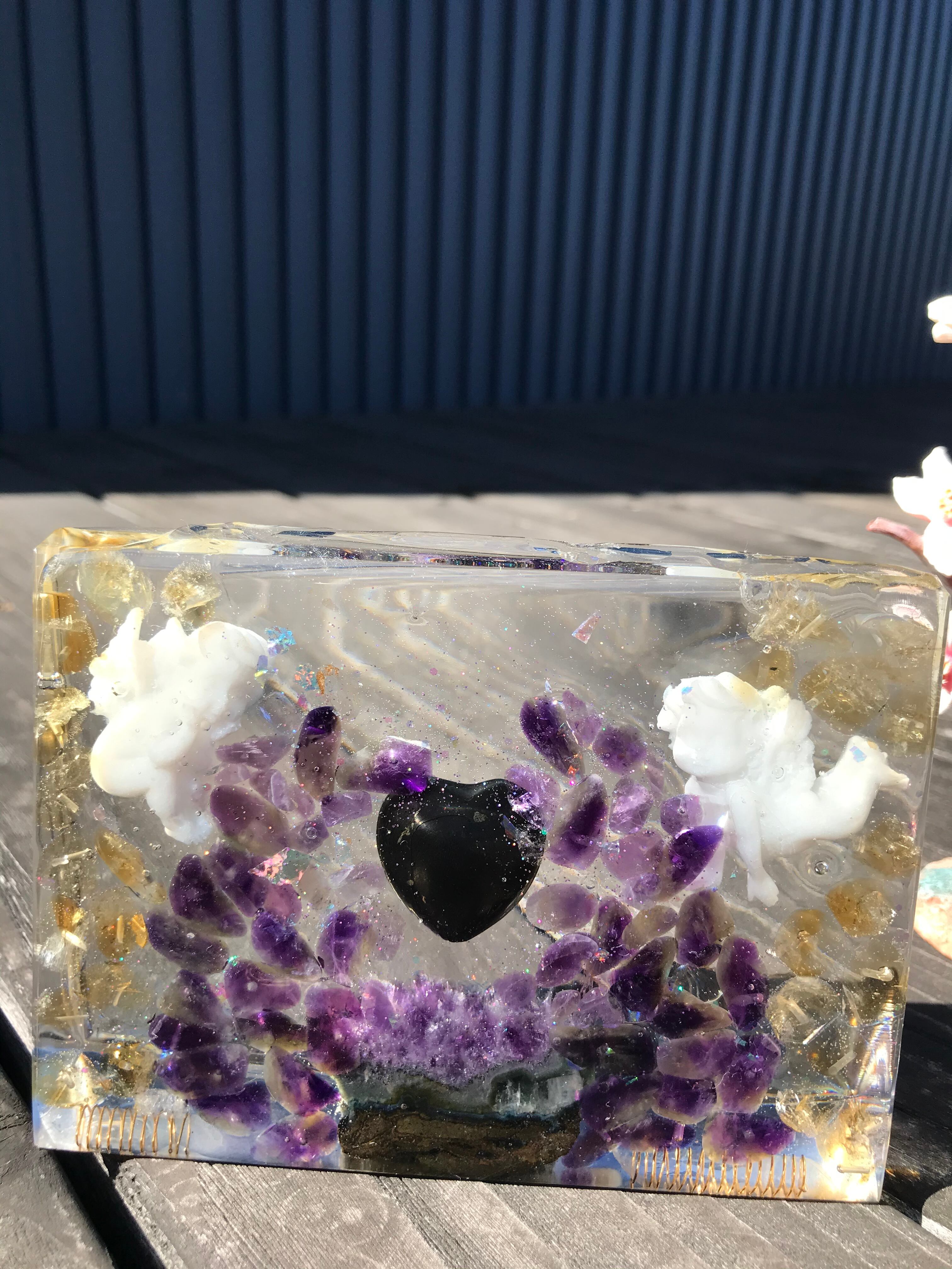 オルゴナイトは、金属や水晶などの鉱物(無機物)樹脂(有機物)で固めたもので、自然界に存在するネガティブなエネルギー(電磁波・放射線・想念など)を吸収し、ポジティブなオルゴン・エネルギーを発生する装置と言われています