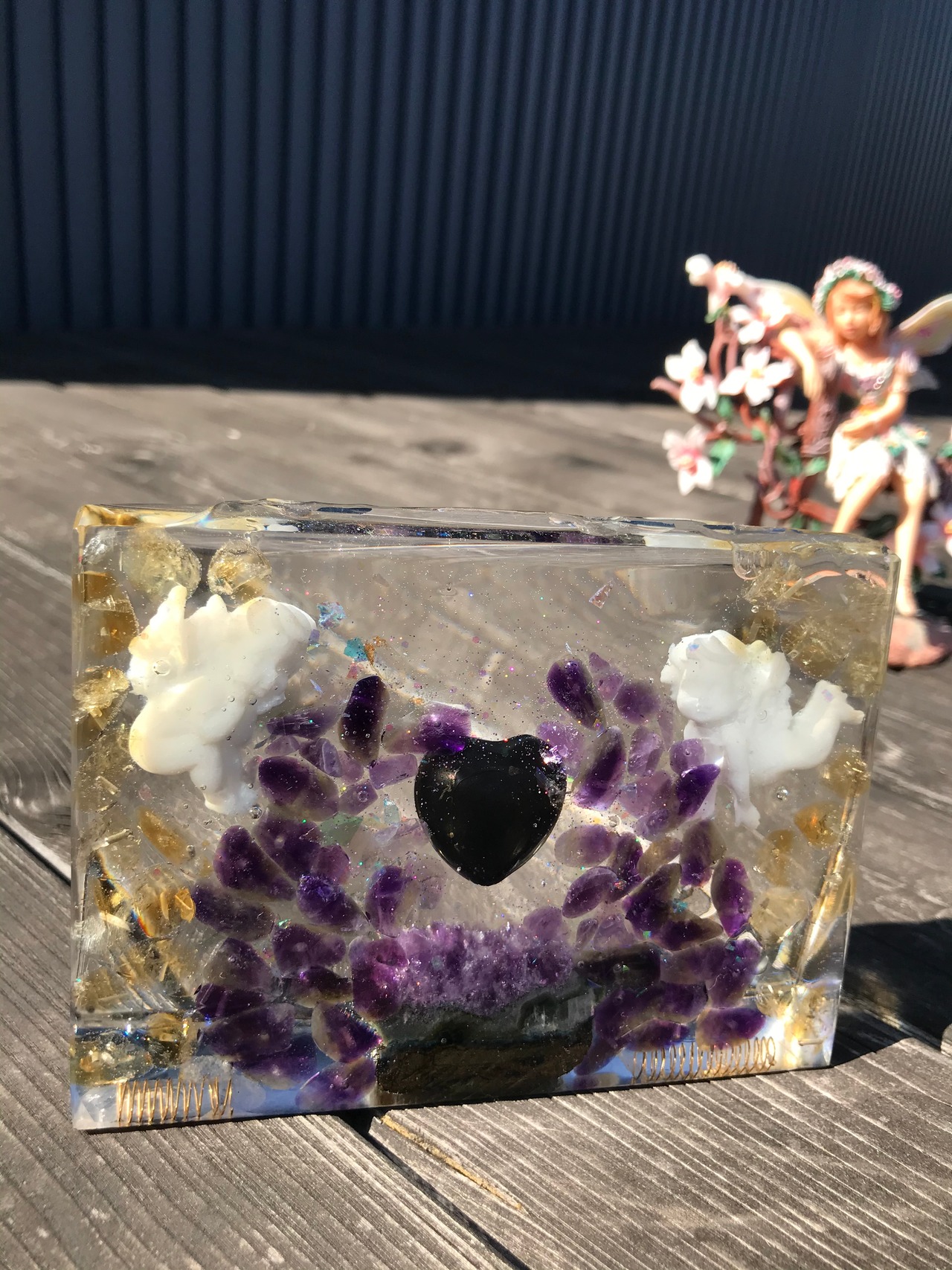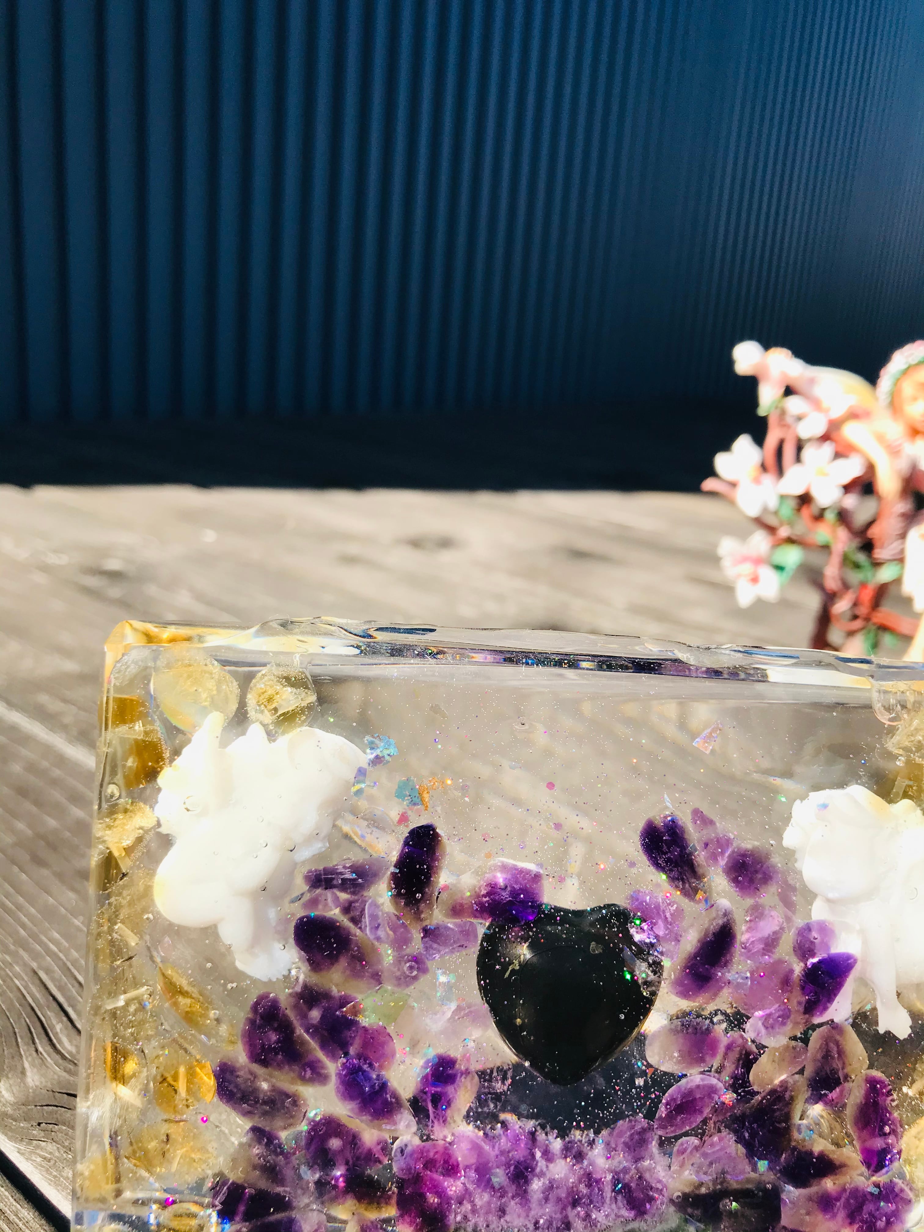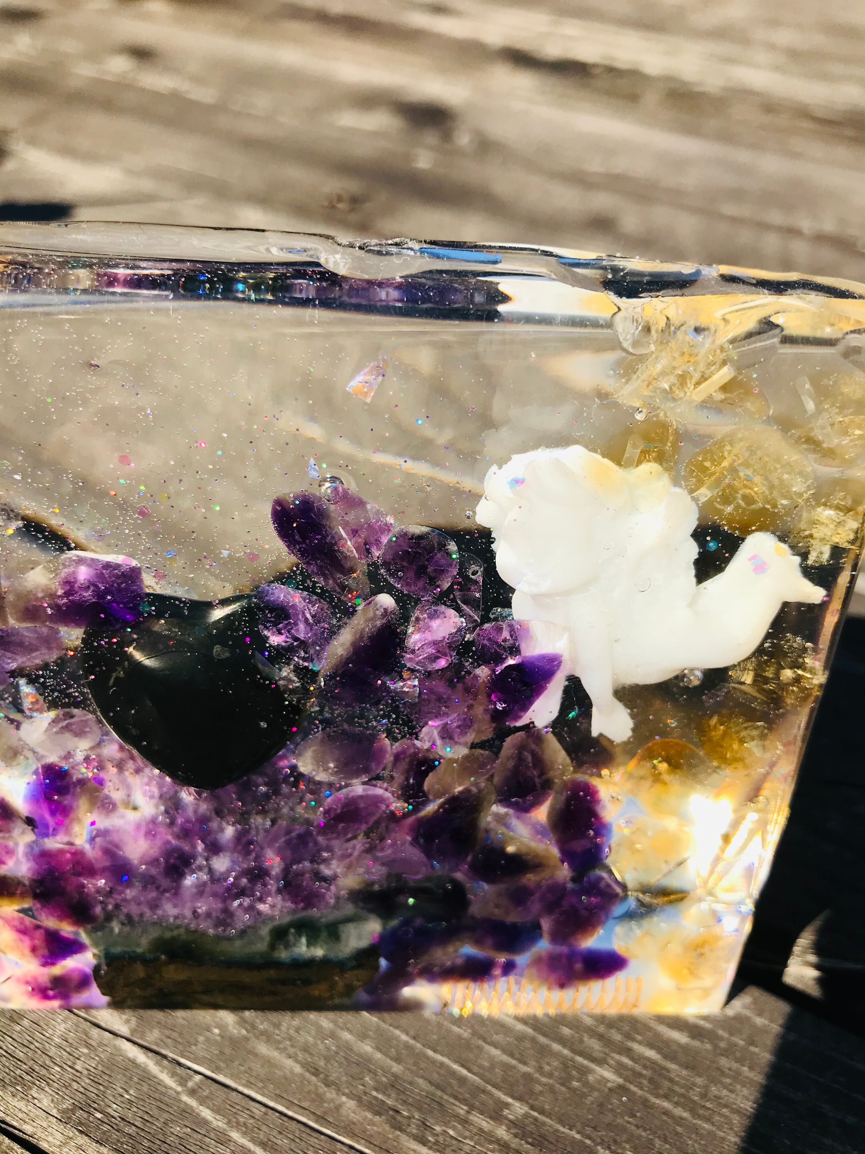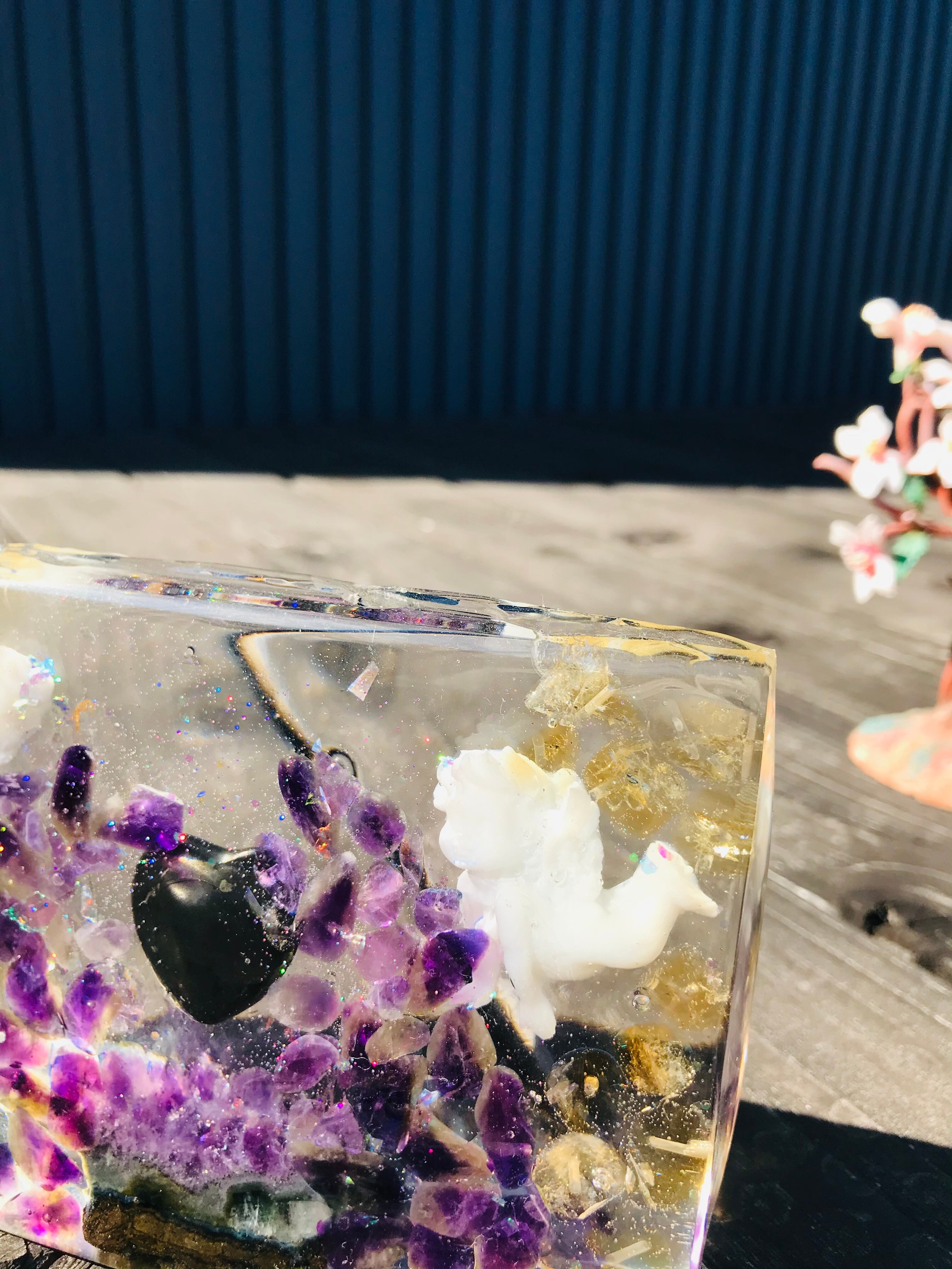 オルゴナイトは、金属や水晶などの鉱物(無機物)樹脂(有機物)で固めたもので、自然界に存在するネガティブなエネルギー(電磁波・放射線・想念など)を吸収し、ポジティブなオルゴン・エネルギーを発生する装置と言われています